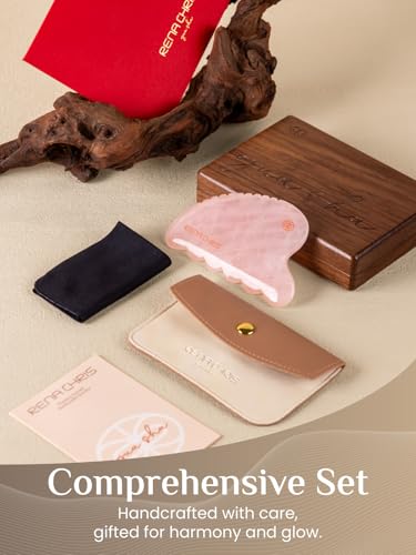 Rena Chris natural rose quartz Gua Sha for face lifting, puffiness reduction, and whole-body massage. Comes with an exquisite wooden box.