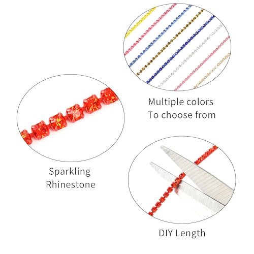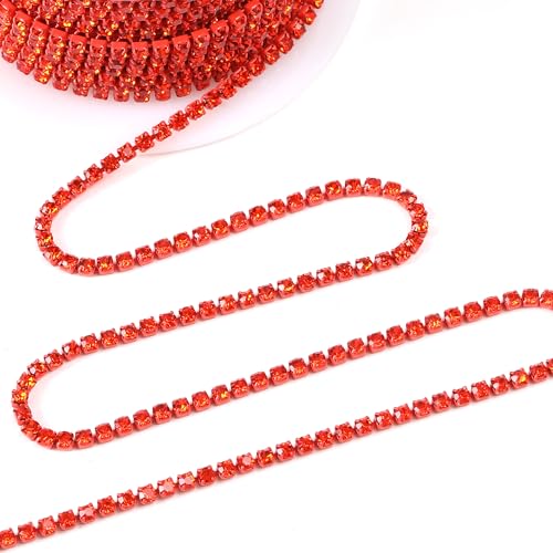 Rytenz 10 yards, 2MM crystal rhinestone close chain trim in red-orange. Perfect for sewing, crafts, DIY decoration, jewelry, clothing, and shoes.