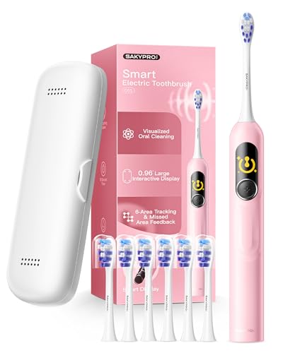 Revolutionize your oral hygiene with the SAKYPRORAL Electric Toothbrush, featuring an innovative AI Smart Screen that provides real-time brushing feedback and mapping. Designed for adults, kids, and teens, this sonic toothbrush comes with 6 brush heads and an incredible 150-day battery life, perfect for long trips. Choose from 5 whitening modes to achieve a brighter smile. Its sleek pink design and included travel case make it both functional and stylish for home or travel use.