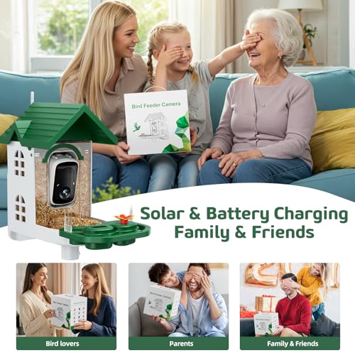 A green solar-powered bird feeder with 2K HD camera, AI bird identification, auto capture, and real-time notifications. Perfect for outdoor birdwatching.
