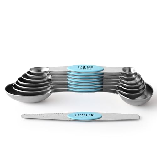 Elevate your culinary precision with the Spring Chef 8-piece Magnetic Measuring Spoons Set in Aqua Sky. Crafted from durable stainless steel, this set includes all essential teaspoon and tablespoon sizes, plus a handy leveler for accurate measurements. The strong built-in magnets keep spoons neatly nested, saving drawer space and ensuring easy access. Ideal for both wet and dry ingredients, these metal spoons are a must-have kitchen gadget for any home chef or baker, offering convenience, accuracy, and a touch of modern design. Dishwasher safe for effortless cleaning.