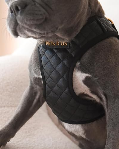 Stylish & durable black dog vest harness with classic quilted design, vegan leather, and breathable mesh. Perfect for small dogs.