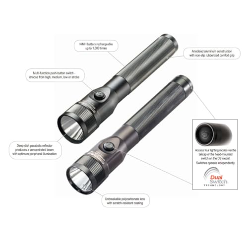 The Streamlight Stinger DS is a versatile and powerful rechargeable LED flashlight, delivering 425 lumens and an intense 26,000 candela for long-range illumination. Its dual-switch design provides convenient activation options from both the head and tailcap. The robust black anodized aluminum construction ensures extreme durability for professional and everyday use. Packaged with a 120V AC/12V DC Smart Charger and a Smart Charge Holder, it offers complete, efficient recharging solutions for continuous performance.