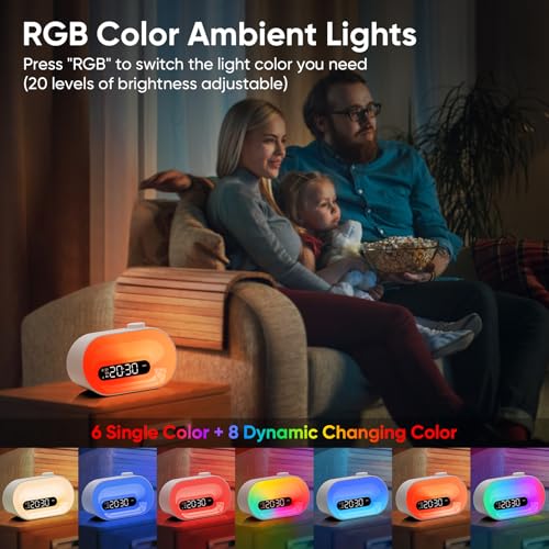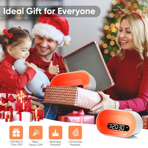 Wake up gently with sunrise simulation and 30 soothing white noise sounds. Features dual alarms, 14 night lights, and a dimmable bedside lamp. Perfect for all ages.