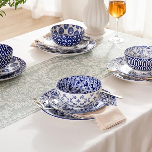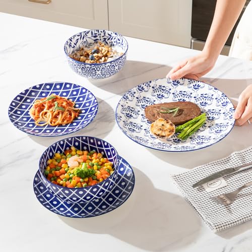 Handmade, scratch-resistant vintage blue ceramic dinnerware set for 4. Includes plates and bowls, microwave & dishwasher safe porcelain.