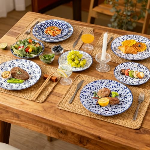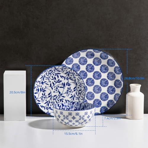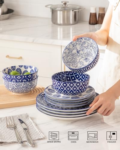 Upgrade your dining experience with the Sweejar 12-Piece Handmade Ceramic Dinnerware Set. Designed for a family of four, this stunning vintage blue set includes plates and bowls crafted from highly scratch-resistant porcelain. Each piece is handmade, offering a unique touch to your kitchen and dining table. Enjoy the convenience of microwave and dishwasher safe dinnerware, perfect for everyday meals and special occasions. This durable and stylish set combines aesthetic appeal with practical functionality, making it an excellent addition to any home.