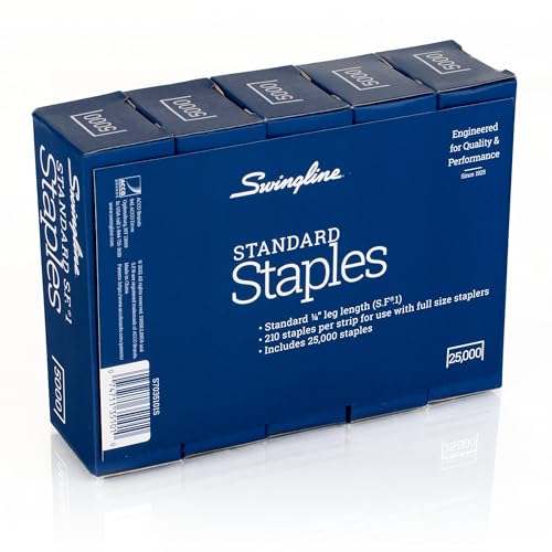 Ensure your documents are securely fastened with this Swingline Standard Staples 5-Pack. Each box contains 5000 high-quality staples, with each strip holding 210 staples. Designed with a 1/4 inch leg length, these staples are perfect for standard desktop staplers, providing consistent, jam-resistant performance. Ideal for home, office, or school use, this bulk pack ensures you always have a reliable supply on hand for all your stapling needs. Experience efficient and smooth document management with Swingline’s trusted quality.