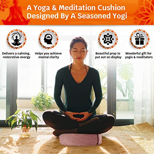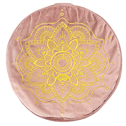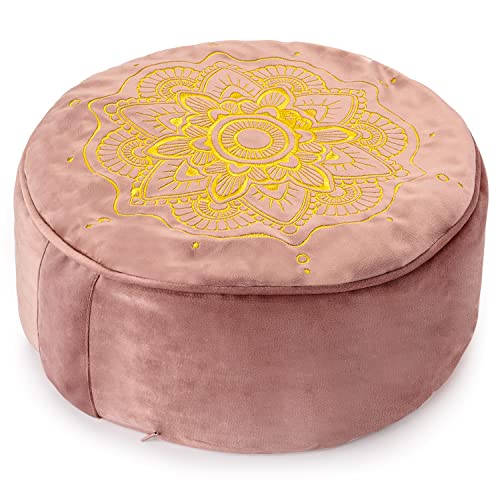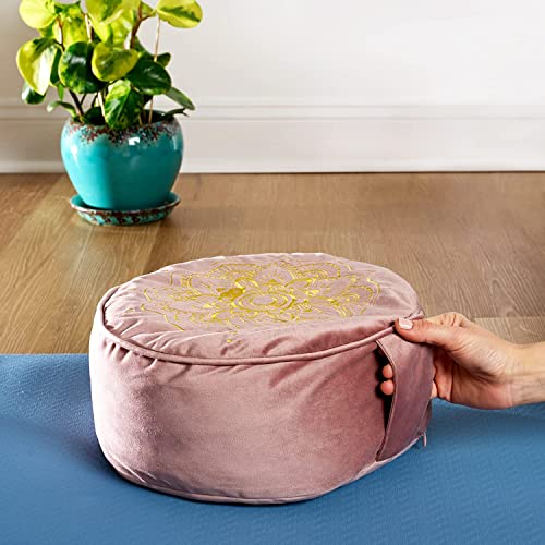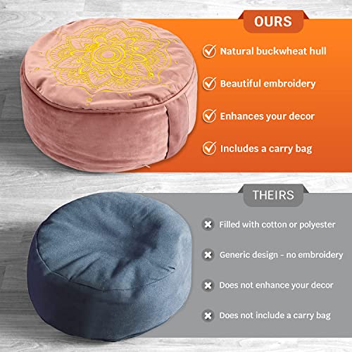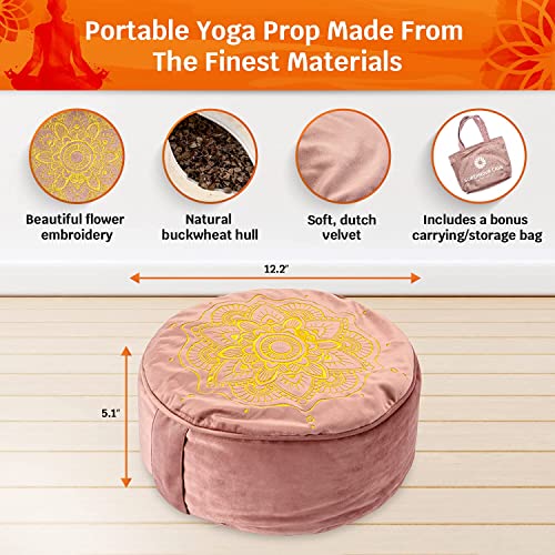 Traditional Tibetan Zafu meditation cushion in Rose Quartz velvet with beautiful embroidery. Buckwheat fill & carrying bag for comfortable, portable practice. Enhance focus & posture.