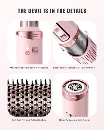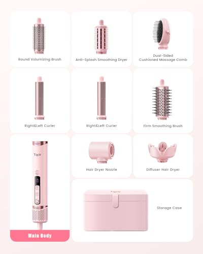 Tqcir 8-in-1 professional hot air styler & hair dryer brush in pink. Powerful multi-styler with auto-wrap curler. Fast drying, straightening, volumizing without heat damage. Storage case included.