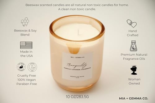 Experience tranquility with this 10oz vanilla, lavender & cedarwood beeswax soy blend candle. Non-toxic, cruelty-free, 65+ hours clean burn. Handcrafted relaxation.