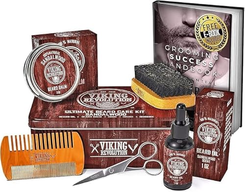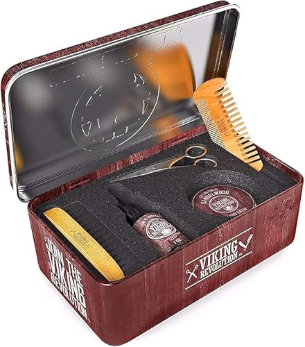 The Viking Revolution Ultimate Grooming Kit for Men provides everything needed for superior beard and mustache care. This comprehensive set includes a premium boar brush for even distribution of oils, a sturdy wood comb for detangling, nourishing sandalwood beard balm and oil for conditioning, and sharp scissors for precision trimming. Achieve a perfectly styled and healthy beard with this all-in-one kit, suitable for daily maintenance and travel.