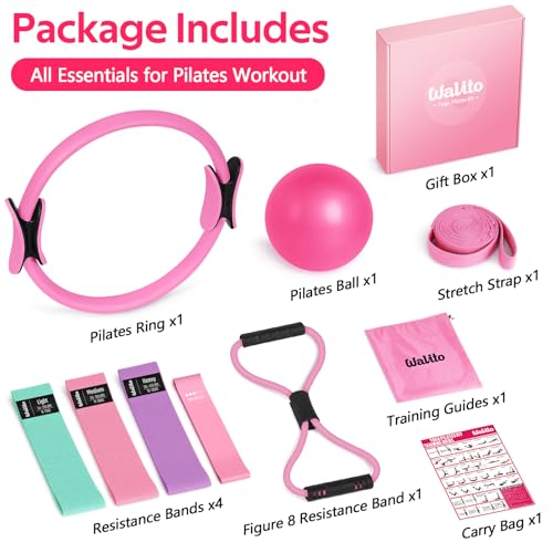 Elevate your home fitness routine with the WALITO Pilates Ring Set, specifically designed for women. This comprehensive kit includes a durable Pilates ring, versatile resistance bands, a figure 8 workout band, a magic circle, and a mini ball. It’s the perfect starter set for toning muscles, improving flexibility, and enhancing core strength. Achieve a full-body workout conveniently at home, targeting thighs, glutes, arms, and core. Ideal for all fitness levels, from beginners to advanced users looking for effective Pilates equipment.