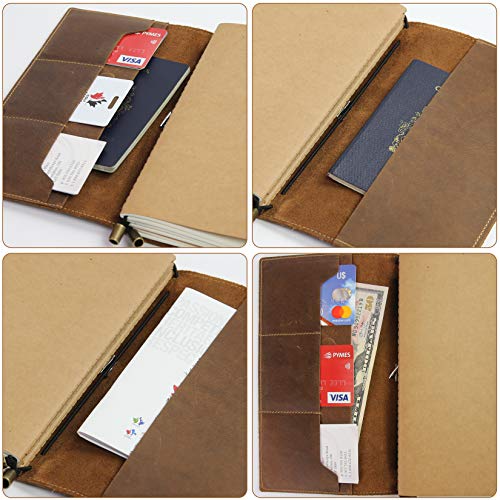 Handcrafted, rugged leather travelers notebook with pockets. Refillable journal, 4.5″x8.5″, 100 GSM blank inserts. Perfect for travel & journaling.