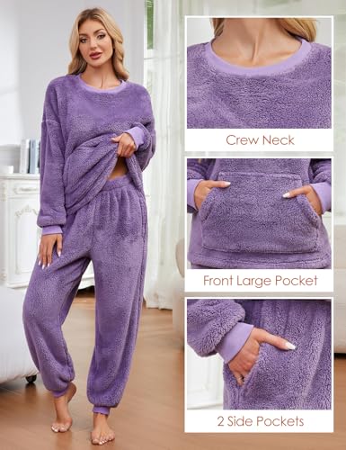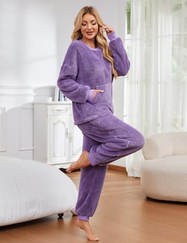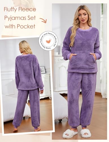 Stay cozy this winter with Wiepux’s fuzzy fleece pajama set for women. 2-piece long sleeve lounge wear in purple. Perfect for chilly nights & relaxation.
