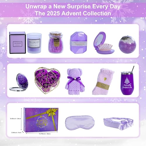 Make her Christmas magical with this exquisite 2025 Advent Calendar for Women. This deluxe spa gift basket features a delightful array of lavender-scented bath and body treats, designed for ultimate relaxation and self-care. It includes everything needed for a pampering experience, plus two charming mugs. An ideal countdown calendar and thoughtful present for your mom, wife, girlfriend, or sister, celebrating the holiday season with luxury.