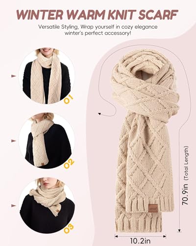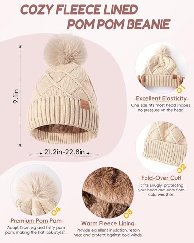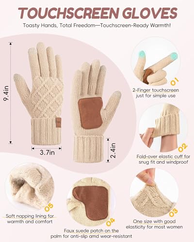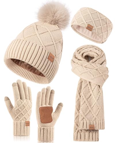 Ultimate warmth with this women’s 4-in-1 winter set: pom pom beanie, knit scarf, touchscreen gloves, & ear warmer headband. Fleece lined, fashionable Oatmeal.