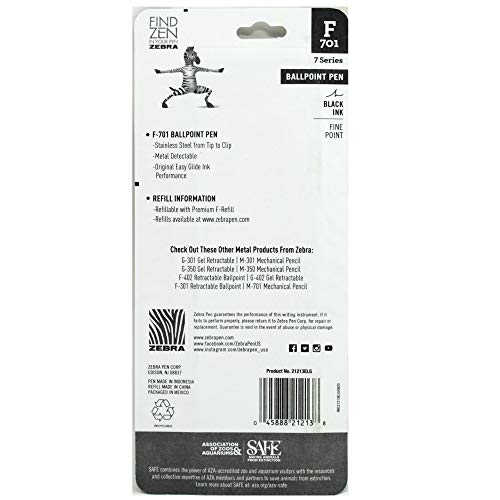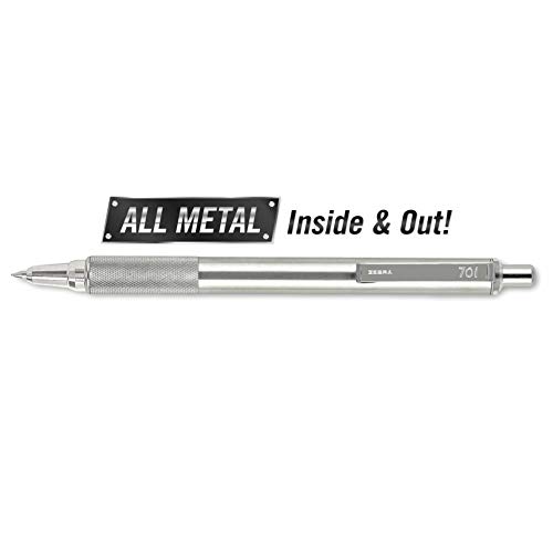Experience the robust Zebra F-701 retractable stainless steel ballpoint pen, 0.8mm fine point, with 1 black pen and 2 refills.